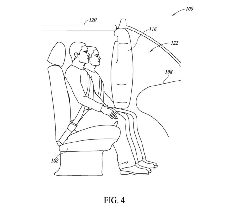 The automaker filed a patent application with the United States Patent and Trademark Office (USPTO) in 2021 (it was published in late 2022) showing roof-mounted airbags that deploy from a vehicle’s headliner and surround the occupants. Now a second application has appeared showing a similar concept.